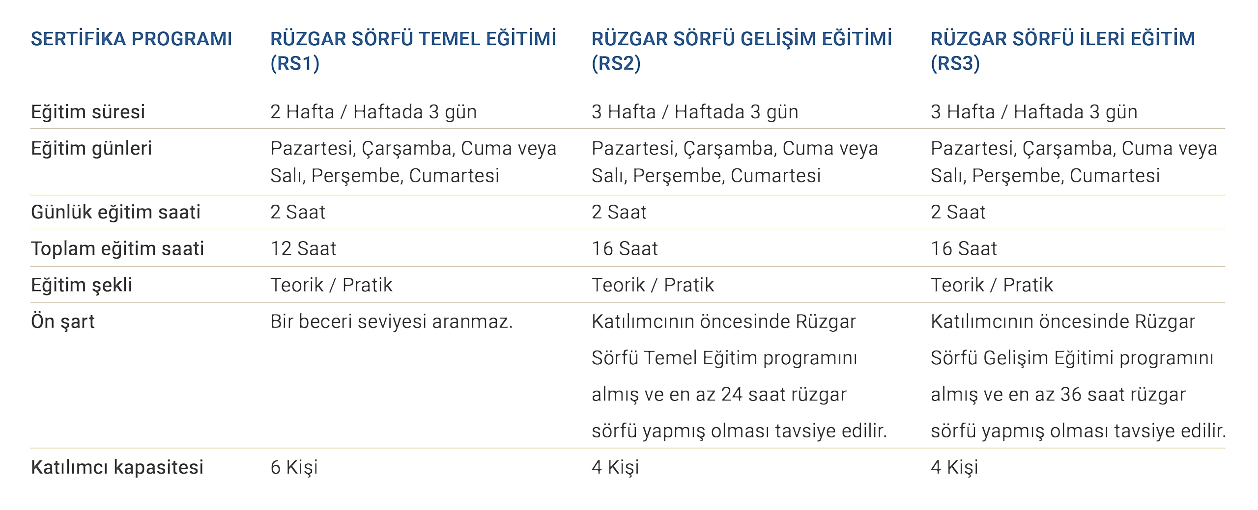 | 08-12 veya 12-16 yaş | 16:00 – 18:00 | Gelişim ve İleri Eğitimi (RS2 ve RS3) |